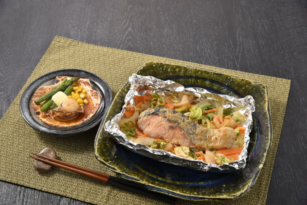 ちゃんちゃん焼きは鮭などの魚と野菜を鉄板で焼く料理で、北海道で漁師町の名物料理です。2007年に農林水産省の主催で選定された農山漁村の郷土料理百選でジンギスカン、石狩鍋と共に北海道を代表する郷土料理として選出されております。本来、外で大きな鉄板の上で大胆に焼き上げる料理ですが、いつでもご家庭で手軽に召し上がれる様、ひと手間加えた鮭の切身を特製の味噌たれに漬け込み一枚一枚を小分け真空いたしました。北海道に古くからある浜の漁師料理をご堪能ください。帆立バター焼きは、北海道産の帆立貝とグリーンアスパラガス・トウ