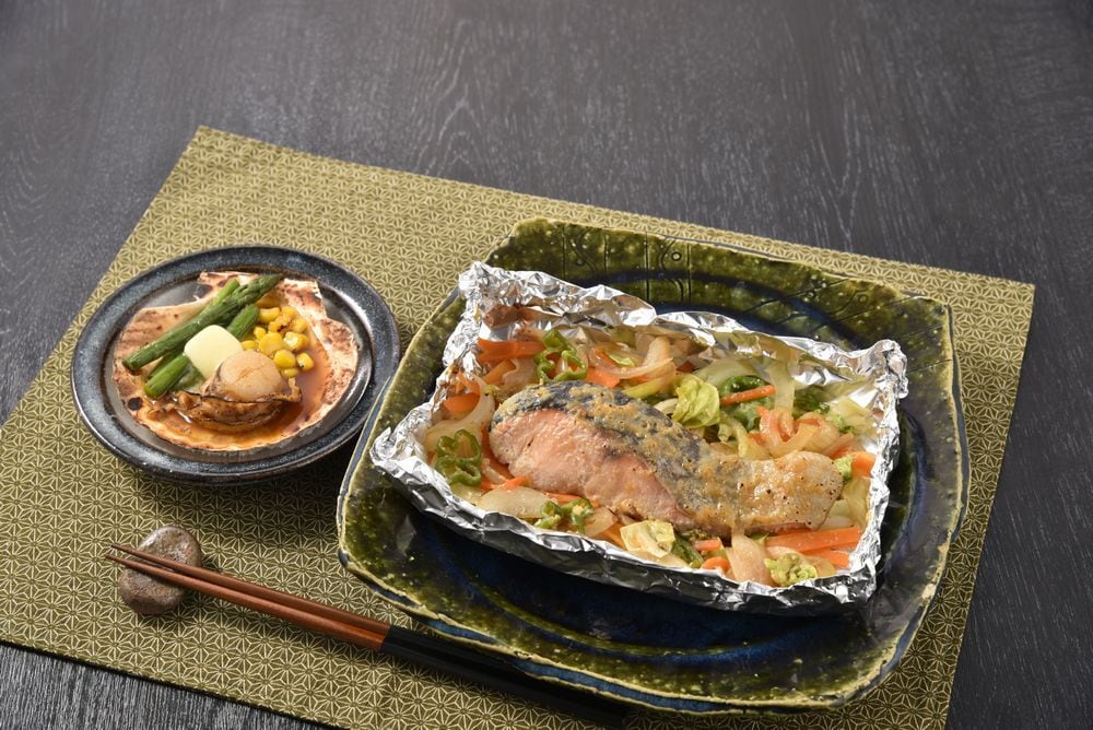 ちゃんちゃん焼き用秋鮭味噌漬切身80g×4枚、添付味噌たれ30g×4袋、帆立バター焼きセット(帆立片貝1枚(北海道産)、アスパラ10g、コーン10g、バター1個入)×4