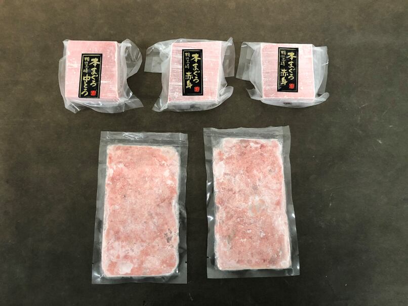 天然本まぐろ中トロ柵100g×1、天然本まぐろ赤身柵100g×2、すきみ100g×2